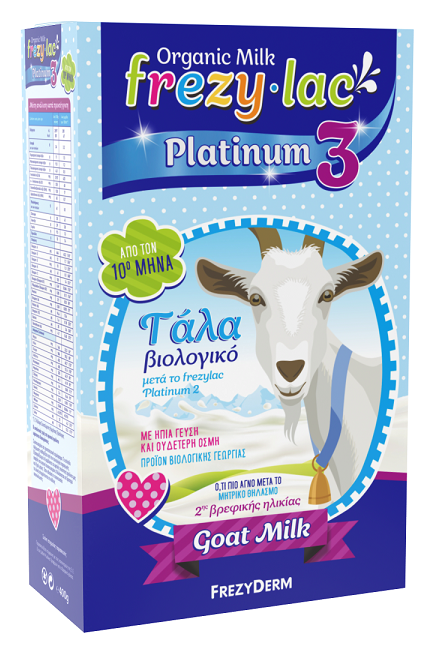 Το FREZYLAC PLATINUM PLUS 3 είναι βιολογικό κατσικίσιο γάλα σε σκόνη, κατάλληλο για βρέφη από τον 10ο μήνα στο πλαίσιο μιας μεικτής διατροφής.